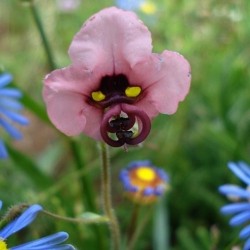 Er is iets mysterieus aan dit bijzondere, Zuid-Afrikaanse bloeiertje! De zalmroze bloemblaadjes geven een lieflijke aanblik, maar het hart en de gekrulde stampers en meeldraden lijken wel een boosaardig insect te imiteren! Vast een lokkertje voor het insect, dat deze bloem wil lokken voor de bestuiving. De bloemetjes zijn 1,5 cm in doorsnee en het compacte plantje wordt 20-30 cm hoog.