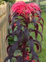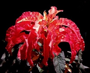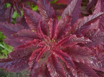 Een prachtige explosie van bladkleuren! De plant groeit eerst met chocoladebruin (vrij langwerpig) blad op tot een slordige 50-90 cm hoog om te “ontvlammen” in een toef bladeren aan de top van felrode kleur. De bloeistaartjes zijn bescheiden aanwezig.