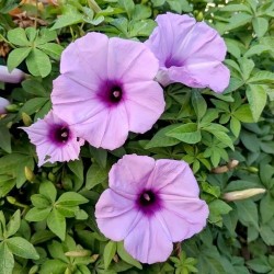 Deze prachtige klimplant behoort tot de bekende windefamilie. De diep ingesneden bladeren zijn al een sieraad op zich, maar de grote kelkbloemen spannen de kroon: lichtlila met donker hart, adembenemend...!