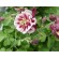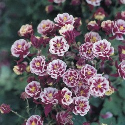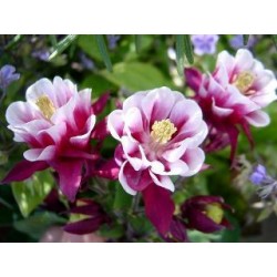 Pittige kleurtje: bloedrode kroonbladeren met korte sporen en enkele kelkbladeren, die dieprood met een wit randje zijn. Hoogte 35cm.