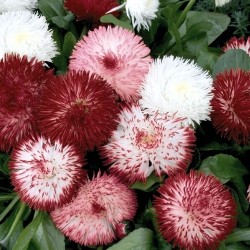 Dubbele, grootbloemige madelief (doorsnee tot 5 cm.) in witte, roze en rode tinten. Vroeg-bloeiende tweejarige plant. Hoogte 15 cm.
