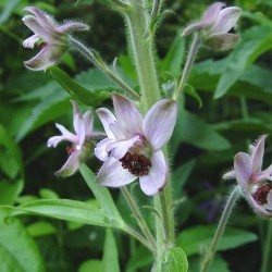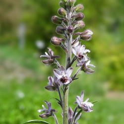 Dit is wel een zeer ongewone en indrukwekkend hoge plant! De harige stengels zijn dichtbevolkt met aparte bloemetjes: orchidee-achtig, purper met blauw-paars van kleur. De flinke bladbasis bestaat uit fraaie, hand- of stervormige, glanzend groene bladeren, elk met een fraaie nerftekening. Dit tweejarige soort groeit gemakkelijk in een rijk, goed gedraineerde bodem, op een zonnige plek. Ze zaaien zich gemakkelijk uit en zorgen zodoende weer voor nageslacht.