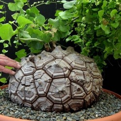 De namen voor deze plant zal je snel duidelijk zijn: aan de basis ontstaat een verhouting met prachtige inkepingen zoals het schild van een schildpad! Vanuit de basis groeien rankjes klimmend langs stokken of touwtjes met hartvormige blaadjes en gele bloemetjes. Deze Zuid-Afrikaanse plant was ook een voedingsbron voor de Khoisan omdat de basis veel zetmeel bevat. Behandel de plant als kamerplant en zet deze gerust in de zomer buiten. Af en toe sterft het blad af, dan wil de plant in rust, geef deze dan wat minder water.