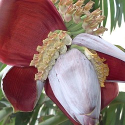 Dit is een van de voorouders van de banaan, die we kennen van de groentekraam. De planten hebben een flinke groeikracht en de grote bladeren groeien wat meer verticaal, dan de meeste bananensoorten. Als de planten oud genoeg zijn, dan ontstaat de fantastische rood, wit en kastanjebruine bloeiwijze waaruit de bananentrosjes ontstaan.