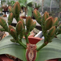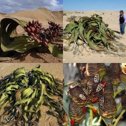 De wonderlijkste plant die ik ken, genoemd naar zijn ontdekker: Friedrich Welwitsch. De plant heeft maar 2 grote, brede bladeren en kan enorme droogte en warmte verdragen. Door de wind splitsen de bladeren zich, maar het blijven er echt maar 2! De wortels van de plant gaan zeer diep, reiken tot diepe ondergrondse waterbronnen en het blad neemt verder alle condens en spaarzame regen zorgvuldig op. De planten in de natuur zijn zeer zeldzaam, ze worden zeer oud en zijn vroeger helaas veel geroofd. Gelukkig zijn er nog reusachtige exemplaren van wel 2000 jaar oud bekend, gemiddeld worden ze 500-600 jaar oud! Geen wonder, dat elke botanische tuin zo’n unieke plant graag hebben wil… In het Afrikaans heet de plant treffend: “Tweeblaarkanniedood”. Wat moet ik nog meer vertellen van dit botanische wonder: het is een naaktzadige plant, net als veel naaldbomen en net als de bekende palmvaren: Cycas. Hoewel de plant niet hoger wordt dan 1,8 m, kunnen de bladeren uitgroeien tot elk 6 m lengte! Hoe droger de omgeving, hoe groter de plant. Je hebt een mannelijke en een vrouwelijke plant nodig voor zaadvorming en een zeldzame rode wants voor de bevruchting. Elk jaar kunnen we dus maar aan een paar honderd zaden komen, die we secuur over onze klanten verdelen, per bestelling kan je maar 1 zakje van 5 zaden bestellen.