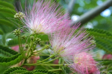 Het dubbelgeveerde blad sluit zich ‘s avonds (slaapboom) en de bloemhoofden hebben tonen een grote toef zachte, wit naar roze meeldraden (als zijde). Deze ‘s winters bladverliezende heester is gemakkelijk te telen en bij ons in toenemende mate winterhard…