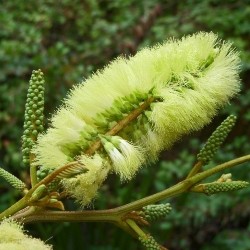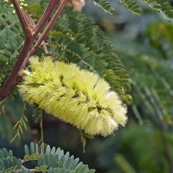 Je zou het aan het exotische uiterlijk niet zeggen, maar deze plant is redelijk winterhard bij ons en groeit uit tot een kleine boom. In een pot of in de vollegrond, het zeer fijne, grote, dubbelgeveerde blad en de citroengele tot crèmekleurige poederkwast-achtige bloemen zullen je verbazen! Na de bloei ontstaan van groen naar bruin kleurende peulen, waarin de zaden al snel zichtbaar zijn.