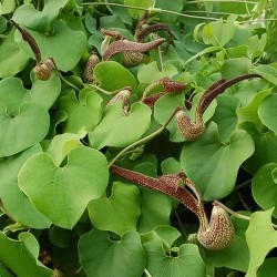 Klimmer met groot, hartvormig blad, die een flinke, elkaar overlappende bladmassa vormen. De verrassing vormen de spectaculaire bloemen, die een buitenissige vorm hebben: vanuit een blaasvormig, wit-paars gespikkelde basis groeit een grote paarse, smalle onderlip en een paars gespikkelde kleinere bovenlip... Je moet ze zien om het te snappen! De plant moet vorstvrij overwinteren.