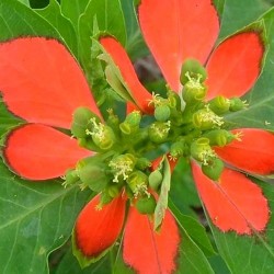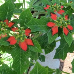 Je kent vast wel de rode Kerststerplant, familie van deze leuke plant. Rondom de bloei vormen zich 5 knalrode blaadjes, vele maken kleiner dan de kerstster en daarom subtiel en schattig... In de tropen kan de plant flink woekeren, dat belooft wat voor deze fraaie potplant. Laat deze dus in een flinke pot groeien, een beetje kou wordt verdragen, maar liever geen vorst. In de zomer kan de plant zowel zon als schaduw verdragen.