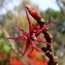 Een zeer fraaie heester met de mooiste herfstkleur van allen! Als je maar 1 plant in de tuin mag zetten voor de herfstkleuren, dan is dit een erg goede keuze... De hoogte na 10 jaar is 2,5 m. De stervormige, mild geurende bloemetjes zijn donkerrood en verschijnen als de hartvormige bladeren al in de mooiste herfsttinten verkleuren: in september en oktober!