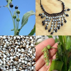 Grassoort uit Indonesië met breed lancetvormig blad. De plant is winterhard tot Zone 9, d.w.z. een lichte nachtvoorst wordt verdragen. De bijzondere bloeiwijze komt uit de oksels: een rond bolvormig vruchtje, wit en hard als een parel, gevolgd door een kort pluimpje. Na drogen (eerst op het veld laten rijpen) ligt het voor de hand, dat de zaden als kralen worden gebruikt. Zeker zo bekend zijn de consumptiekwaliteiten van Jobstranen: de zaden worden gekookt en zijn dan door de milde, prettige smaak een goede aanvulling in soepen, bij een grote oogst is het een goede tarwe- of rijstvervanger. Van geroosterde zaden maak je een redelijke surrogaat-koffie en de zaden laten zich ook fermenteren tot bier of wijn. Het hoge proteïnegehalte is vrij bijzonder. Hoogte 60-80 cm.