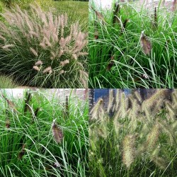 Zwierig en toch strak zijn deze zeer winterharde siergrassen in een mix van mooie soorten: P. alopecuroides, P. alopecuroides 'Black Beauty', ‘Red Head’, P. japonicum, P. villosum en P. orientale. Ze groeien in de tuin van Ton de Waard en kruisen onderling tot mooie tussenvormen. Hoogte 75-100 cm.