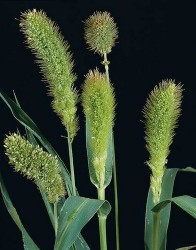De iets hangende dikke gierst-aren hebben eerst een lichtgroene kleur, mooi voor boeketten. Het lancetvormige blad is vrij breed. Vanwege de geringe hoogte (70 cm) is dit soort ook als tuinplant bijzonder populair. De vogels smullen ervan in de herfst! Dan zijn ze inmiddels beigebruin afgerijpt.