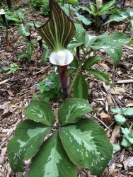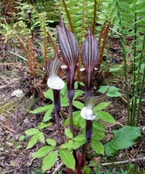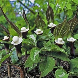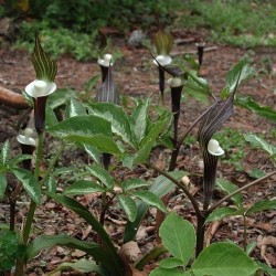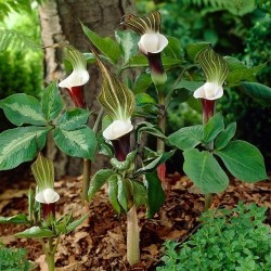 Volgens veel liefhebbers de Koning(in) onder de Arisaema’s! De veelkleurigheid en eigenaardige vorm zijn daar de oorzaak van. Het vingervormige blad bestaat uit 5 delen en verkleurt van effen groen naar groen met grijsgroene marmering. Als snel na het ontstaan van deze bladeren (op zo’n 30 cm hoogte) verschijnen de kokervormige, aronskelkbloemen: dieppaarse kelken aan de buitenzijde en helderwit van binnen met een ronde knots (of bloeikorf) op een steeltje, net een goed beschermde parel! De bloemschede is puntig en iets overhangend, in bruin-groen-witte kleur. Zoals bijna alle Arisaema’s is deze soort prima winterhard, bij een zeer strenge vorst is het echter wel wijs om extra blad aan te brengen.