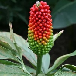 Dit is wel een van de hoogste Arisaema’s, op 1-1,5 m hoogte torenen de wit-groen-lila bloemen (meestal) boven het vingervormige blad uit. De bloeikolf (of knots) groeit uit tot een lange staart, die recht omhoog steekt. Geef ze zeer humeuze grond en plant ze gerust 10-20 cm diep voor een stevige groei. Na de bloei ontstaan in de herfst prachtig dikke trossen met rode bessen. Je vindt dit soort in het wild vooral in het Indisch subcontinent.