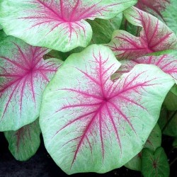 De grote pijlvormige bladeren zijn heel licht, mintgroen met lilaroze, fijne nerven.