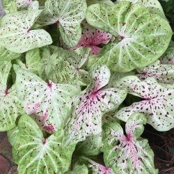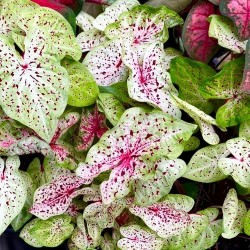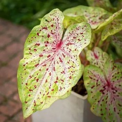 De grote pijlvormige bladeren zijn wit met geelgroen, rozerode of witte nerven en speelse, rozerode spikkels.