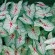De grote pijlvormige bladeren zijn helderwit met groene nerven en groene omranding.