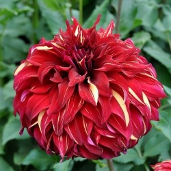 De koning van de zomerbloeiende knollen! De grote verscheidenheid aan kleur en vorm, de adembenemende volmaakte vorm en de goede houdbaarheid op de vaas maakt deze bloem zo populair! Een zgn. Decoratiefbloemig Type, d.w.z. met brede lintbloemen. De zeer grote bloemen zijn purperrood met hier en daar speelse lichtgele strepen. Hoogte 100 cm.