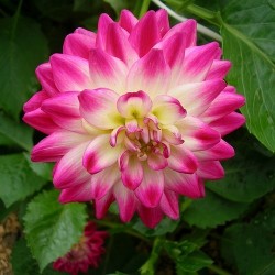 Een zgn. Decoratiefbloemig Type, d.w.z. met brede lintbloemen. Deze dahlia lijkt rechtstreeks ontsnapt uit de snoepwinkel... De felle kleuren vrolijken elke hoek gegarandeerd op! Fel purperroze, naar het centrum ivoorwit. Een beauty (die blijkens de naam) kennelijk naar ome Henk is genoemd.
