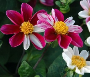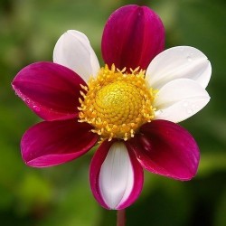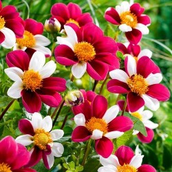 Topmix Dahlia's zijn compact groeiend: hoogte 50-75 cm. Ze bloeien zeer rijk met kleine bloemen. Enkele bloemblaadjes zijn wit, andere zijn diep wijnrood en sommige zijn zelfs stoutmoedig tweekleurig. Deze originele Dahlia kan niet beslissen welke kleur het wil worden, zodat het maar besloten heeft om beide aan te nemen!