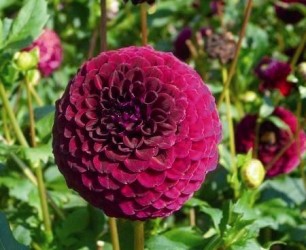 De koning van de zomerbloeiende knollen! De grote verscheidenheid aan kleur en vorm, de adembenemende volmaakte vorm en de goede houdbaarheid op de vaas maakt deze bloem zo populair! BIOLOGISCH GETEELD! Baltype dahlia's vormen met korte, brede lintbloemen een grote balvormige bloemvorm. Eigenlijk een grote vorm van het pompontype. Hoogte 90 cm. Dieppurper van kleur.