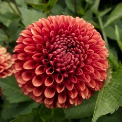 Baltype dahlia's vormen met korte, brede lintbloemen een grote balvormige bloemvorm. Eigenlijk een grote vorm van het pompontype. De kleuren (donker)rood, koper en brons vechten om voorrang in deze prachtige volle jongen! Sterk in de tuin en op de vaas... Hoogte 90 cm.