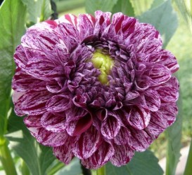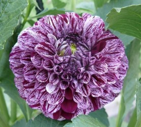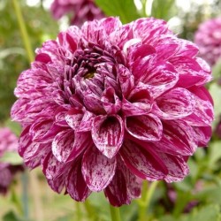 De koning van de zomerbloeiende knollen! De grote verscheidenheid aan kleur en vorm, de adembenemende volmaakte vorm en de goede houdbaarheid op de vaas maakt deze bloem zo populair! Baltype dahlia's vormen met korte, brede lintbloemen een grote balvormige bloemvorm. Eigenlijk een grote vorm van het pompontype. Prachtig bolvormige bloem met sierlijke kleurstrepen: wit met paarsrode dikkere en dunnere strepen. Hoogte 70 cm.