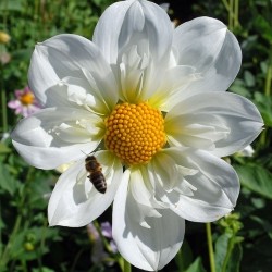 De naam van dit type zegt al iets: deze enkelbloemige heeft rond het bloemhart een extra kraagje van bloemblaadjes met een contrasterende of combinerende kleur. Hoogte 100 cm. Het helderste wit dat je kan bedenken en een zelfde helderwitte kraag van lintbloemen rond het gele hart.