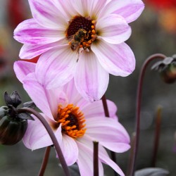 Classic dahlia's luiden de comeback in van ouderwetse en historische, donkerbladige dahlia’s. De bloemvorm is enkel of halfdubbel met zichtbaar hart. Hoogte 90 cm. De lichtviolette kleur wordt speels afgewisseld met lichte (bijna witte) streepjes.