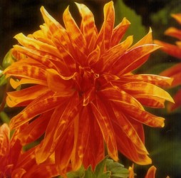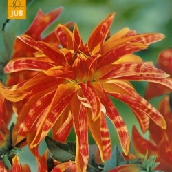 De koning van de zomerbloeiende knollen! De grote verscheidenheid aan kleur en vorm, de adembenemende volmaakte vorm en de goede houdbaarheid op de vaas maakt deze bloem zo populair! Weer terug in ons sortiment! Vrij grote bloemen met vrij smal bloemblad en gevlekte kleurverdeling. Hoogte 70 cm. Oranje met lichtoranje dwarse streepjes.