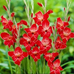 Lage gladiool (60 cm hoogte) met sierlijke bloemvorm, ontstaan uit kruisingen rond 1900, en nog steeds ontwikkelen kwekers nieuwe kleurencombinaties. Helderrood met speelsw witte omranding.