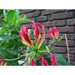 Problemen met plantengroei in een zonnig venster ? Probeer de Gloriosa ! Zet hem in een diepe pot met luchtige grond (turfmolm o.a), maak een raamwerk van wat tonkinstokken, en deze sterk groeiende klimmer zal u in de gloeiende zon verrassen met de exotisch aandoende, roodgele bloemen. De 6 bloemdekbladen zijn teruggeslagen en buiten deze steken de meeldraden en stampers. Trekt de aandacht van chemici omdat er geen ziektes bestaan in deze plant. De topmaat knollen zijn Hollands geteeld, dat betekent betere en gezondere groei.