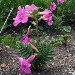 Een gemakkelijke tuin- of potplant met fris en mals, varenachtig blad die vanaf de zomer gaan bloeien op stengels van 40-60 cm hoog. De bloemen hebben een fraaie trompetvorm in lilaroze kleur. We kochten extra grote wortelstokken zodat je een robuste plant kunt verwachten. Geef de planten een flinke laag winterdek, goed gedraineerde grond, dan overleven ze vrijwel zeker de vorst.