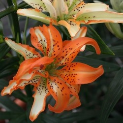 Zeer bijzondere, dubbelbloemige Aziatische Lelie, 90 cm hoog. Het oranje bloemblad met “tijgerstreepjes” heeft hier en daar een crèmewitte streep, soms ontstaat aan dezelfde bloemtros bijna geheel witte bloemen: heel speels!