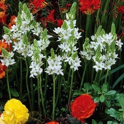 Met lancetvormig blad als basis bloeien deze importbollen uit Japan met zeer houdbare in trossen bloeinde bloemen. De conische bloeiwijze van deze sterke bloem is dicht bezet met helderwitte, komvormige bloempjes van 2,5 cm in doorsnee. Hoogte 35 cm.