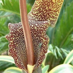 Deze Voodoolelie is een enorme opvaller in je tuin! De knol kan ook droog bloeien in het voorjaar: er komt een enorme bloemschede met een even zo lange bloeikolf uit de knol. De bloemen worden groter naarmate de knol groeit. De kleur is crème met bruinrode spikkels en omdat dit een aasbloem is (die vliegen nodig heeft voor de bestuiving) komt er een zoet weeïge lucht van de bloemen af, geen goed idee om ze binnen te zetten tijdens de bloei, of juist wel als grap...