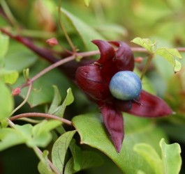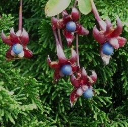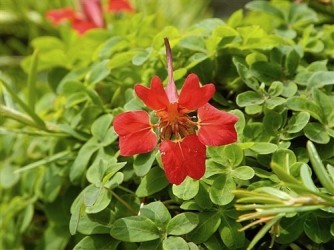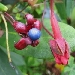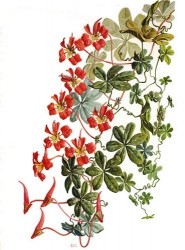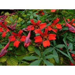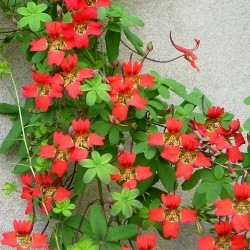 Prachtig (Chileens) familielid van de bekende Oost-Indische kers. Het eerst opvallende zijn de zesvingerige blaadjes (die doen denken aan Helleborus of Schefflera): een sierlijke basis voor de helderrode bloemen. Vanuit het stervormige kelkje groeien de 5 bloed- tot lichtrode bloemblaadjes: ze beginnen heel dun, zodat het wel lijkt of de bloemblaadjes zweven! Aan de achterzijde van de bloem zit een sierlijk lang spoortje. Na de bloei kleurt het kelkje vuurrood en vormt het zaad in felblauwe bessen. Dit zeer rijkbloeiende klimmertje vormt dunne wortelstokjes, die met veel winterdek overwinteren. Oppotten en vorstvrij overhouden kan ook. Geef ze schaduw aan de voet. Merkwaardig genoeg blijft de plant niet vast op z'n plek. Hij gedraagt zich echt als een wortelstok en 'wandelt' telkens een stukje verder de tuin in.