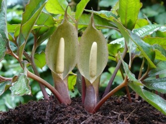 Dit zeldzame soortje groeit in het gebergte van China ten noordoosten van Yunnan. Op 3360-4000 meter hoogte in het natte grasland vind je deze unicum! Tegelijk met het pijlvormige blad komen de bloemscheden uit de grond. Het blad heeft een mooie donkere stengel is donkergroen met paarse gloed in een waaiervorm, hoogte ongeveer 25 cm. De bloemschede is lichtbruin gevlekt en vormt gemakkelijk zaad, zodat de plant zich goed settelt in de tuin. Uiteraard zijn de planten geheel winterhard en komen vrij laat (in mei) boven de grond.