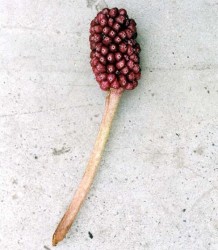 Een zeldzamere aronskelk uit China met een grote bruinpaarse bloemschede op lichtere basis en een dikke, rozerode bloeikolf. De pijlvormige bladeren worden ca. 50 cm hoog en verschijnen laat in het voorjaar. De bloei is gelijktijdig met het verschijnen van het blad. Geef de plant een halfbeschaduwd plekje. De knollen zijn behoorlijk winterhard, je mag ze rooien en vorstvrij overwinteren.