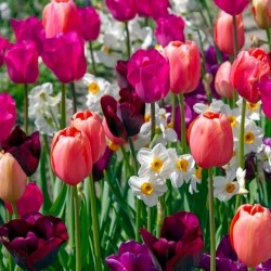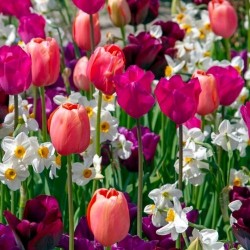 Het feest van de contrasterende kleuren: dit mengsel van 3 kleuren Tulpen in lila, donkerpaars en zalm komen extra mooi uit in combinatie met de wit met oranje Trosnarcisjes. Hoogte 40-65 cm, bloeitijd april-mei, 100 bollen is voldoende voor 1-2 m² (als je geen grond meer wilt zien).