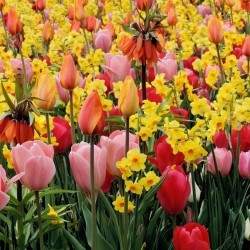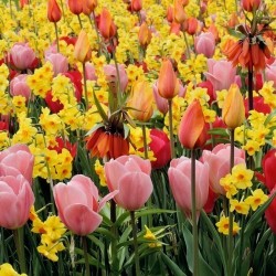 De geel met oranje Trosnarcissen spelen een belangrijke rol in deze combinatie en zijn daarbij de basis van een spannende mix Tulpen en Keizerskronen in geel, oranje en roze. Hoogte 50-80 cm, bloeitijd april-mei, 100 bollen is voldoende voor 1-2 m² (als je geen grond meer wilt zien).