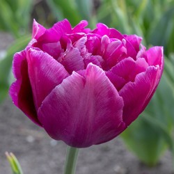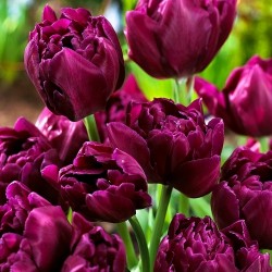 Kort tulpje met dubbele bloemen (meerdere rijen bloembladen). Lange bloei! Dieppaarse, dubbele bloemen. In de zon oplichtend…