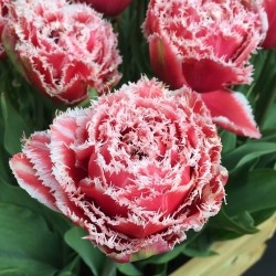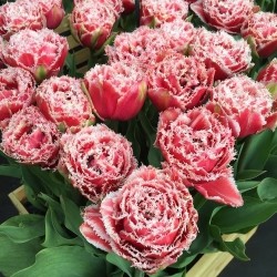 Ouderwetse "bewerkte" tulpen zijn weer helemaal in en exclusief! Een bijzonder speels effect: de bloemen zijn langs de randen gekarteld en iets lichter getint. EXCLUSIEVE TULP! Zeer dubbelbloemig, rozerood aan de basis en oplichtend wit langs de gefranjerde bloemranden!