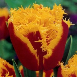 Ouderwetse "bewerkte" tulpen zijn weer helemaal in en exclusief! Een bijzonder speels effect: de bloemen zijn langs de randen gekarteld en iets lichter getint. Felrood met gele franjerand