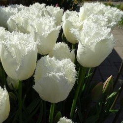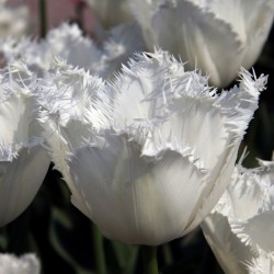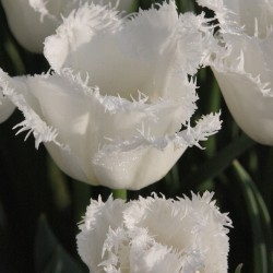 Ouderwetse "bewerkte" tulpen zijn weer helemaal in en exclusief! Een bijzonder speels effect: de bloemen zijn langs de randen gekarteld en iets lichter getint. Puur witte gefranjerde Tulp. Een blikvanger in de tuin. Opvallende tuintulp maar ook geschikt voor in een pot op terras of balkon. Mooi om te combineren met andere gefranjerde Tulpen.
