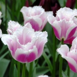 Ouderwetse "bewerkte" tulpen zijn weer helemaal in en exclusief! Een bijzonder speels effect: de bloemen zijn langs de randen gekarteld en iets lichter getint. Lilaroze met ruime, helderwitte omlijsting