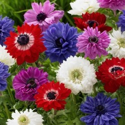Verreweg de bekendste Anemoon, geliefd als snijbloem en al in 1850 vanuit Frankrijk in ons land geïntroduceerd. Er zijn twee bekende typen: het De Caen-type met grote, fraai gekleurde, enkelvoudige bloemen en het St.Brigid-type met halfgevulde bloemen en vrij smalle bloemblaadjes. Verlangen voedzame humeuze grond en met enig winterdek is de plant voldoende vorstbestendig. Voor het planten de knolletjes een nachtje in water weken. Vrolijk mengsel van witte, rode, roze, lila en blauwe tinten. Dubbelbloemig met zichtbare bloemharten.