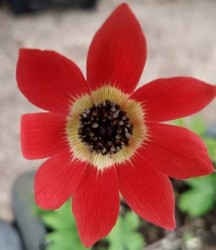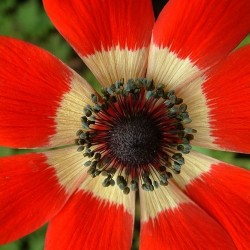 TAMELIJK ZELDZAAM! Dit rijkbloeiende anemoontje is rond 1850 geïntroduceerd, waarschijnlijk een kruising tussen A. pavonia x A. hortensis, die inheems zijn in het zuiden van Frankrijk. Ze bloeien erg gemakkelijk en rijker dan de gelijkende Anemone coronaria. Middengrote scharlakenrode bloemen met een geelwitte binnenzijde en een zwartpaars hart: wat een schitterend contrast! Geef ze een lekker warm plekje met voldoende humus en vocht.