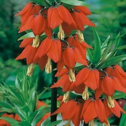 Een rariteit onder de keizerskronen: onder de krans van de oranjerode klokvormige bloemen zit nog zo’n krans: een dubbele hoeveelheid bloemen dus! Zachtpurperen strepen en crèmewitte nectarklieren zorgen voor extra verfraaiing.
